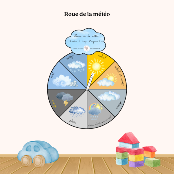 Découvrez notre roue de la météo aux jolies illustrations en aquarelle, un outil ludique pour initier les enfants à l’observation quotidienne. Chaque jour, l’enfant déplace la flèche pour indiquer la météo : soleil, nuages, pluie, neige… Une activité simple qui développe le vocabulaire, la routine et le sens de l’observation tout en apportant une touche décorative à l’espace d’apprentissage. Pratique et esthétique, cette roue aide l’enfant à se repérer dans son environnement et à mieux comprendre les phénomènes météorologiques.